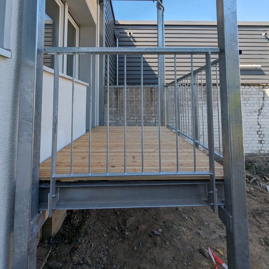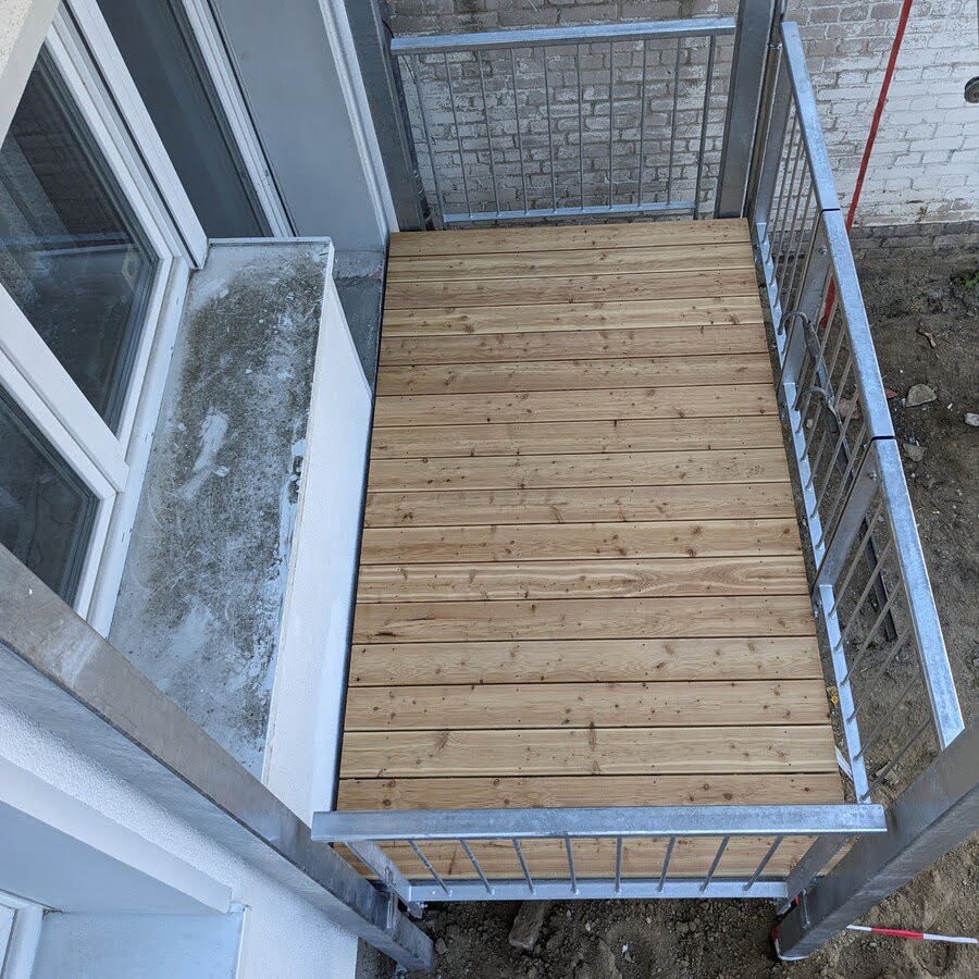 Vorgestellter Stahlbalkon P23 Für ein Mehrfamilienhaus in Berlin-Pankow haben wir nachträglich Stahlbalkone hergestellt und montiert. Der Balkonbelag ist aus Lärche mit einer Wasserführung aus Aluminium. Oberfläche Feuerverzinkt. Berlin 2025. Weitere Bilder zum Projekt Weitere Projekte Wendeltreppe Teutonenstraße Wendeltreppe Moll12 Stahlbalkon Mitte